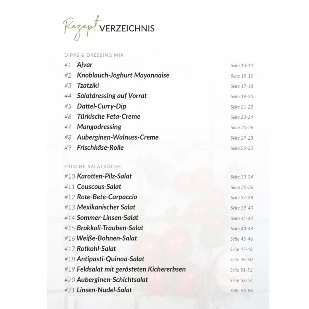 Thermomix®* Rezeptübersicht aus ‚Gemeinsam genießen Band 2‘ mit Salaten, Antipasti & Fingerfood – jetzt im fitgemixt Shop erhältlich.