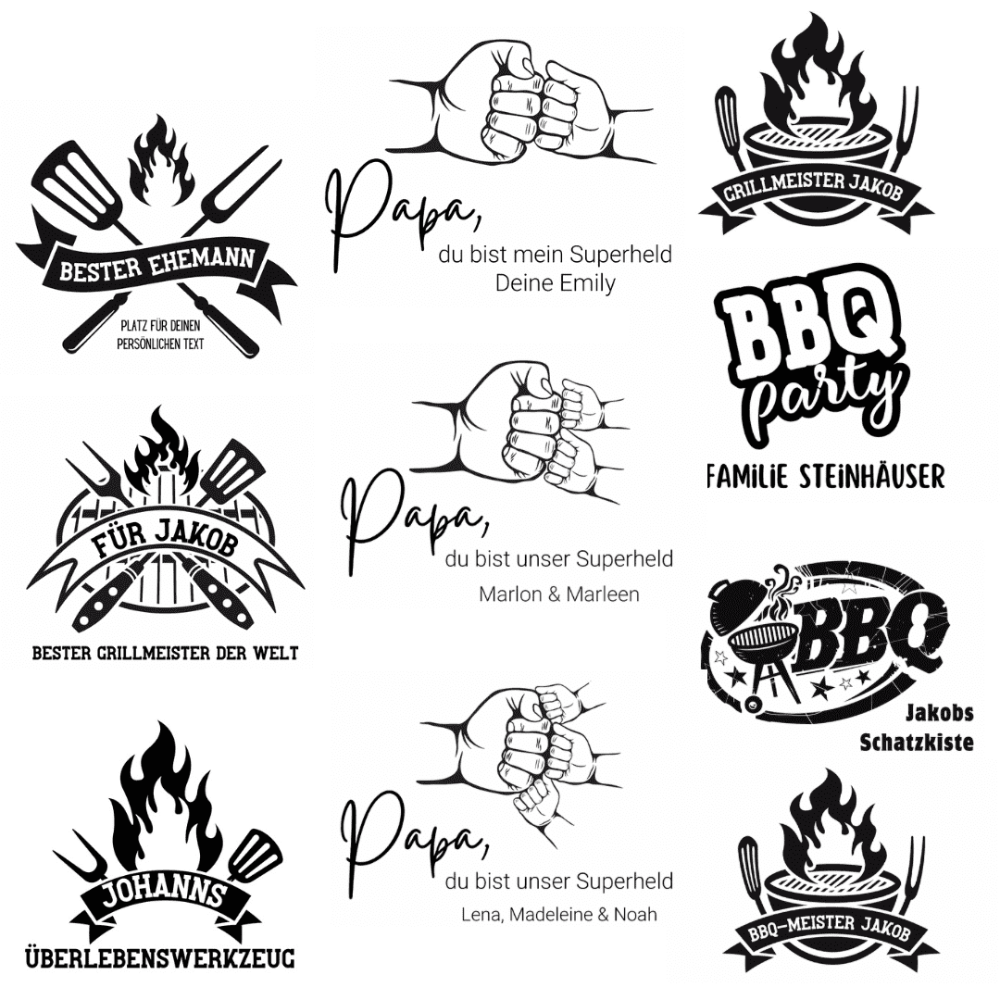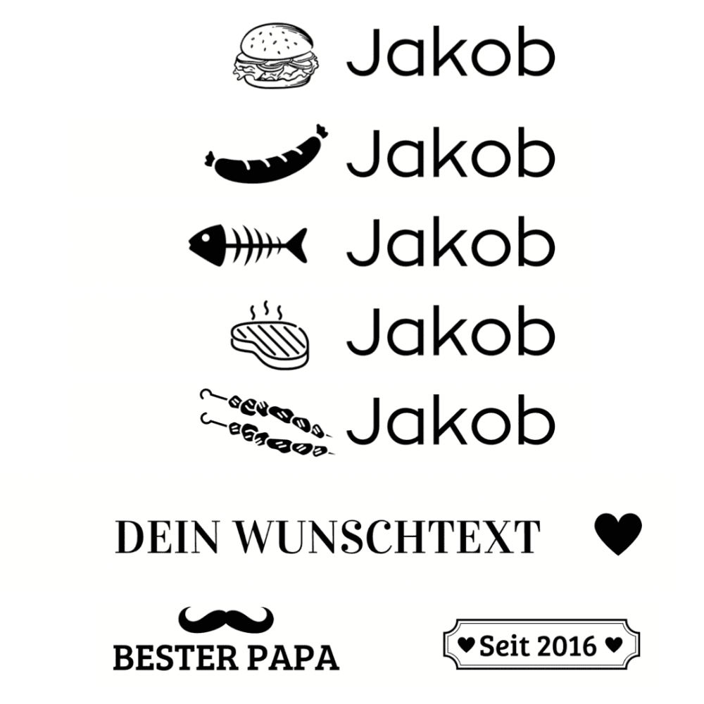 • wähle optional für die Gravur des Grillbestecks aus insgesamt 7 Sprüchen mit deinem Wunschtext (max. 12 Zeichen*)