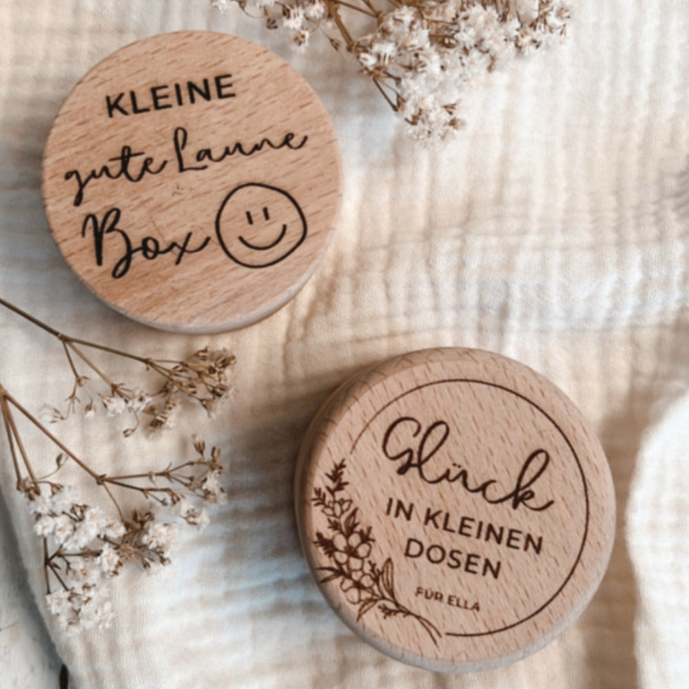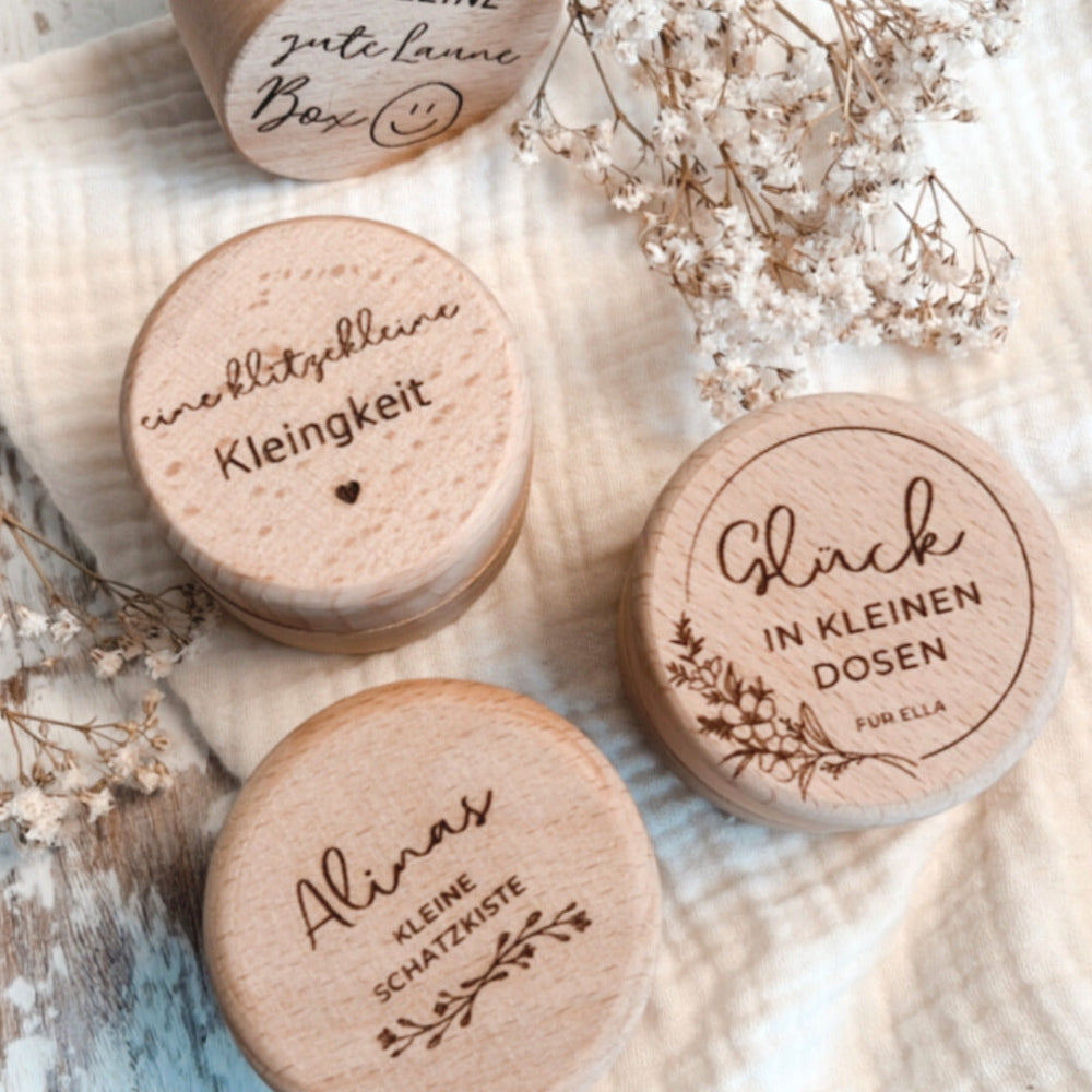 Schenke eine kleine Freude, die lange bleibt: Unsere runden Geschenkdosen für Mitbringel sind die liebevolle Verpackung für Geld und Schmuck, zugleich aber auch die perfekte Milchzahndose oder eine Dose für die erste Locke. Jede Dose wird auf Wunsch personalisiert und so zu einem einzigartigen Erinnerungsstück, das Herzen höherschlagen lässt ♥.