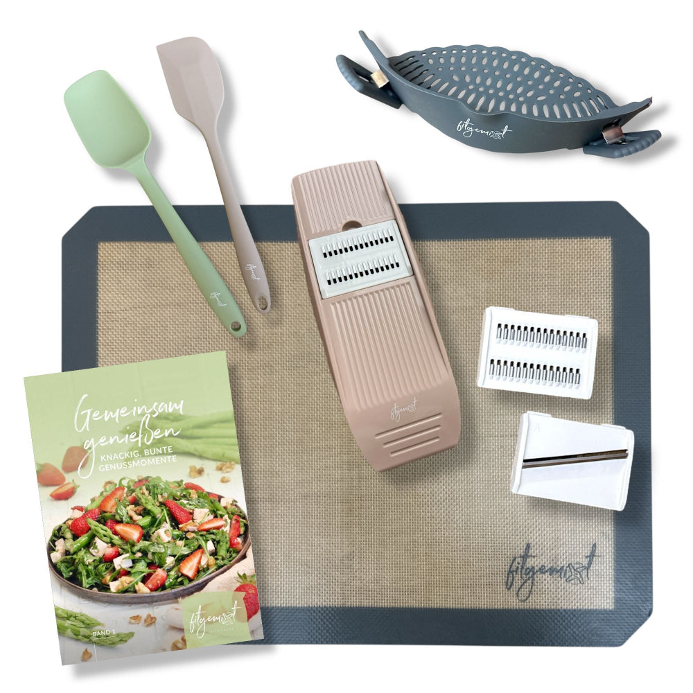 Unser Set kombiniert alles, was du für gelingsichere Gerichte brauchst: vom vielseitigen 3-in-1 Küchenhelfer über die flexible Abgießhilfe FitGießer bis hin zur hitzebeständigen Silikonmatte. Abgerundet wird das Ganze durch unser beliebtes Partyrezepte-Kochbuch „Gemeinsam Genießen Band 1“ mit 40 abwechslungsreichen Ideen für deine Thermomix®* Küche ♥.