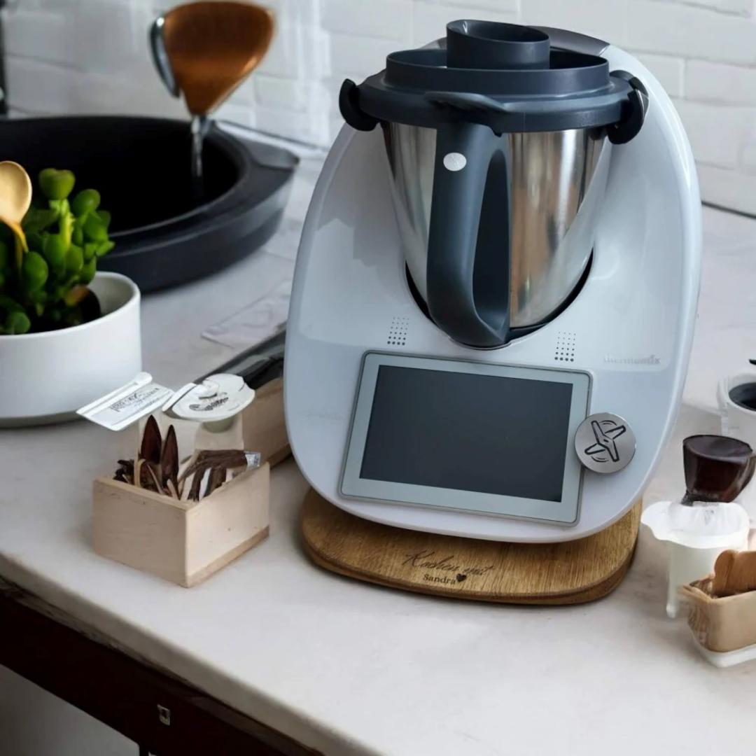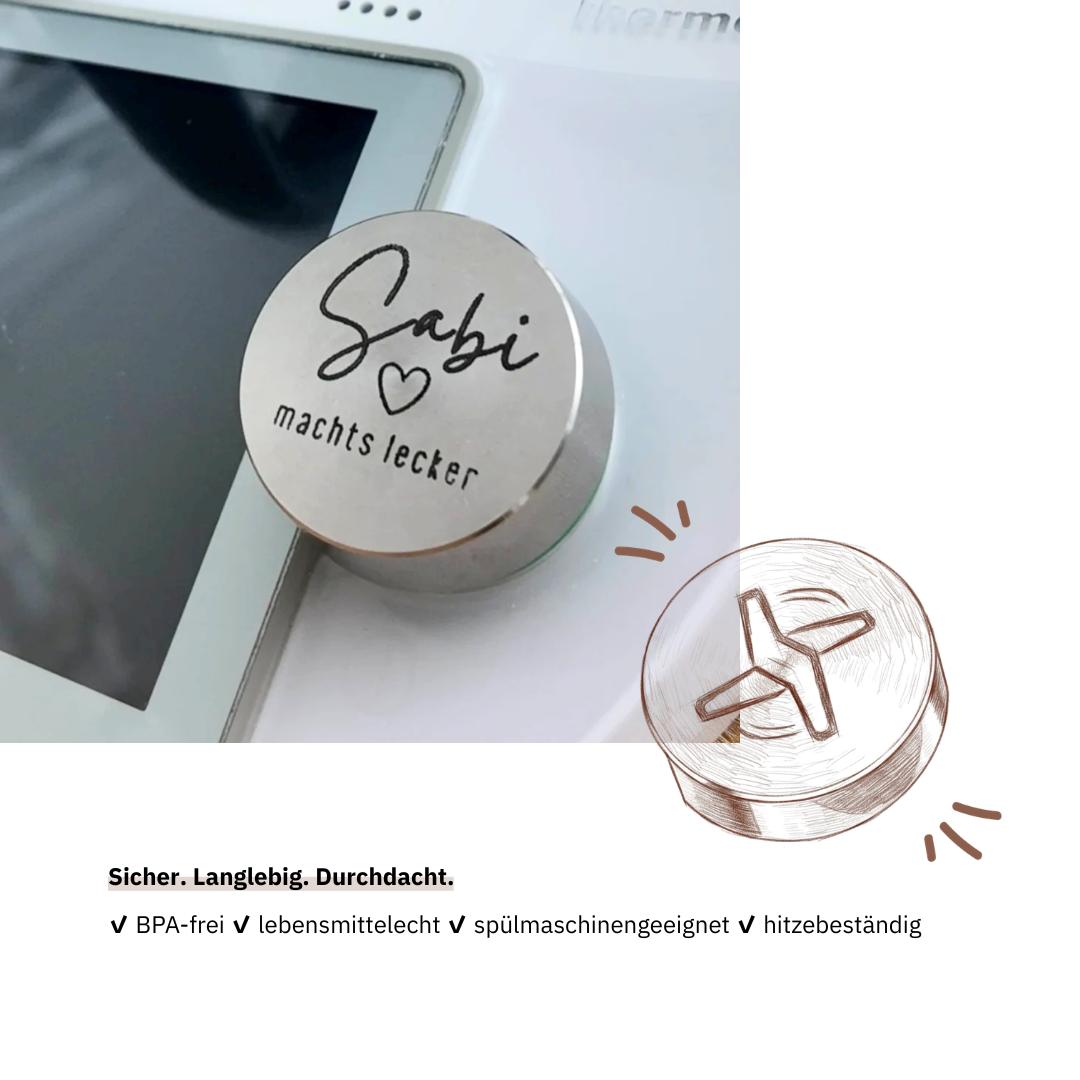 Der Thermomix®* ist ein unverzichtbarer Helfer in vielen Küchen. Umso wichtiger ist es, dass er gut geschützt ist. Unsere in Deutschland designte und selbst entwickelte Drehknopfabdeckung FitTopper aus hochwertigem Edelstahl bietet genau diesen Schutz. Diese hochwertige Edelstahlabdeckung ist speziell und passend für den Thermomix®* TM6* und den Thermomix® Friend* entwickelt und schützt den Thermomix®* Drehknopf nicht nur vor Verschmutzungen, sondern verleiht ihm auch einen coolen und individuellen Look durch die Möglichkeit der personalisierten Gravur mittels unserer umfangreichen Spruch- oder Motivauswahl.