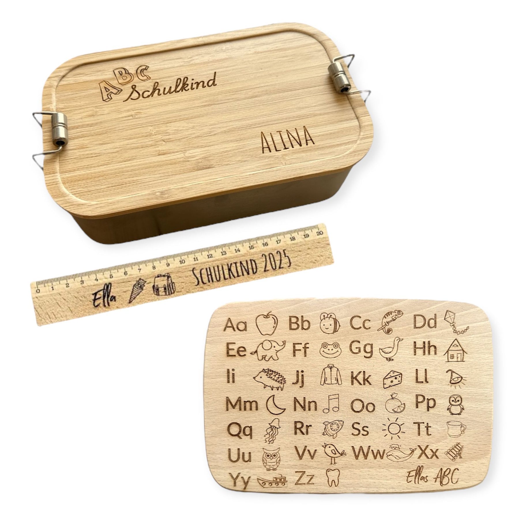 Personalisiertes Schulstart-Set mit Lineal, Lunchbox & Brett. Ideal zur Einschulung – mit Name & Motiv graviert. Jetzt bei fitgemixt entdecken!