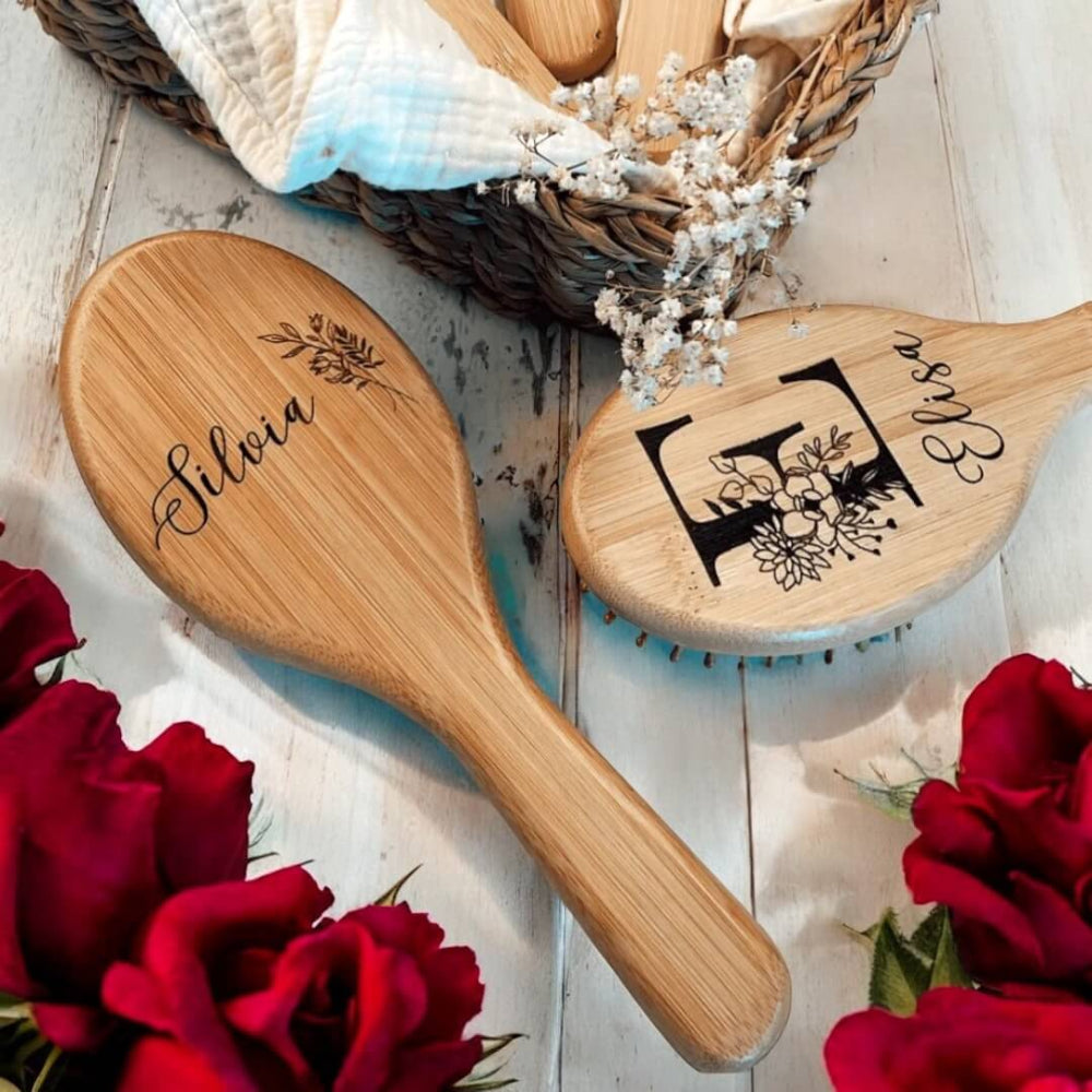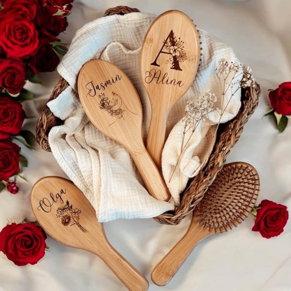 Die Haarbürste mit Namen & Motiv aus hochwertigem Bambus verbindet natürliche Pflege mit persönlichem Design. Ob mit einem niedlichen Tiermotiv und Namensgravur für Kinder oder einem stilvollen Schriftzug für Erwachsene – jede Bürste wird individuell nach deinen Wünschen graviert. So entsteht ein persönliches Lieblingsstück, das sanft durch das Haar gleitet und gleichzeitig die Kopfhaut pflegt.