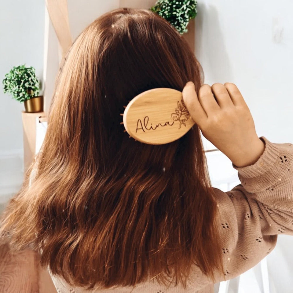 Einzigartige Kinderhaarbürste mit individueller Gravur aus Bambus - Jetzt im fitgemixt Shop bestellen.