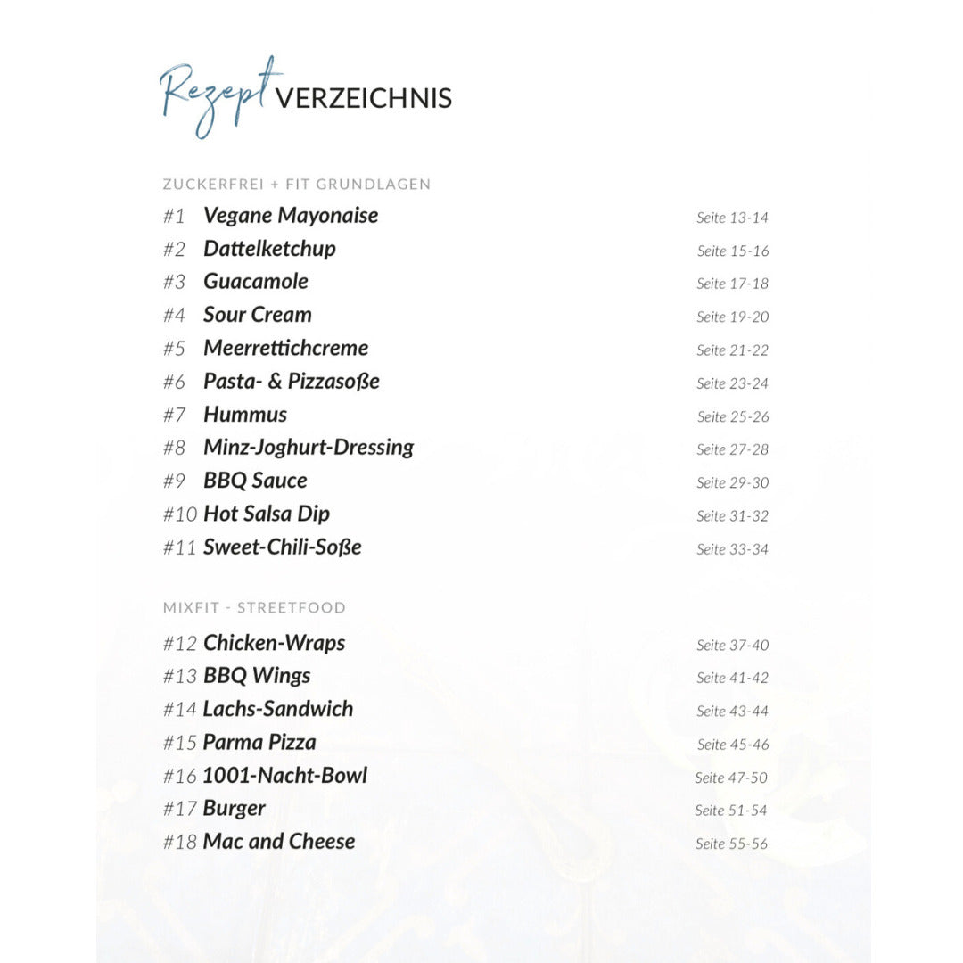 Rezeptverzeichnis des Diät-Rezeptbuchs Feel Good Fast Food von Fitgemixt mit zuckerfreien und fitten Grundlagen sowie Mixfit-Streetfood
